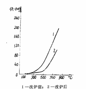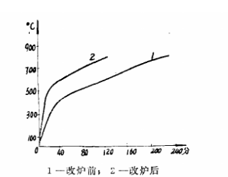 RJ冬45一9改裝前后空載升溫試驗(yàn)曲線見圖1所示,升溫階段耗電量與溫度關(guān)系曲線見圖2所示。由圖可見,當(dāng)爐溫由130℃升至800℃時(shí),加熱時(shí)間從215分縮短到108分;耗電量由147度下降到90度。