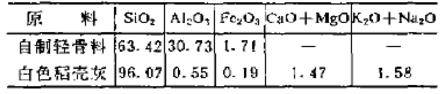 主要原料為自制輕骨料和白色稻殼灰。化學成分見表2,輕骨料的容量為1.61g/cm3、顯氣孔率為42%,耐壓強度27MPa。