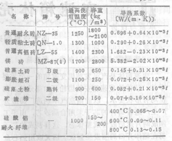 爐襯的主要作用是隔熱保溫。在選用上要滿足使用溫度、工作壽命,筑爐成本、能源消耗、施工難易等一系列要求,不論耐熱材料還是保溫材料都不應長期超溫使用。表2列出了常用的耐熱材料和保溫材料。