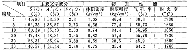 配方的選擇:以漂珠為主要原料,加入不同量軟質(zhì)粘土,并用高鋁礬土來(lái)調(diào)節(jié)制品的含量,再加入少量鋸木屑及 其它添加劑,通過(guò)試驗(yàn)尋求體積密度分別為0.5、0.6、0.7、0.8、0.9及l(fā).Og/cm3的各種配方。經(jīng)試驗(yàn)篩選出6個(gè)較理想的配方。 試制的樣品呈淡黃或深黃色,表面致密,沒(méi)有裂紋,強(qiáng)度較高。試樣主要技術(shù)指標(biāo)列于表3。