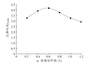 由圖3可以看出,硅酸鋁纖維加入量為質量分數1%以下時在水中的分散情況比較好,纖維能夠均勻地分散懸浮于水中,如果濃度過大,則會使纖維由于分散不開而發生絮聚,加快沉降。其中,纖維加入量在質量分數0.6%時,分散性能最好。