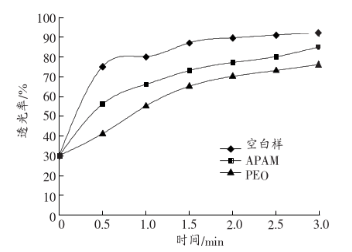 PEO和APAM是造紙中常用的分散劑。實驗選用經過打漿處理的硅酸鋁纖維漿料作為實驗漿料,在漿料中加入分散劑的質量分數分別為0、0.5、1.0、1.5、2.0和2.5%(相對于硅酸鋁纖維用量)。通過實驗表征硅酸鋁纖維的分散性能及透光率。結果分別見圖4和圖5。