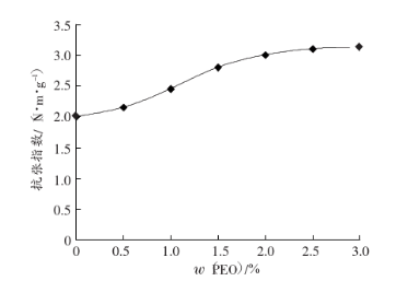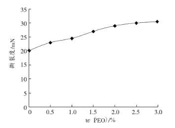 硅酸鋁纖維在不加入膠黏劑的情況下不能成紙,因此加入w(cmc)=10%作為膠黏劑,然后改變PEO的加入量,檢測PEO的加入量對成紙強度的影響。結果見圖6和圖7。