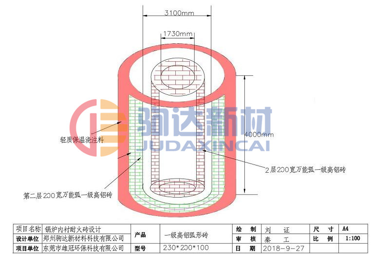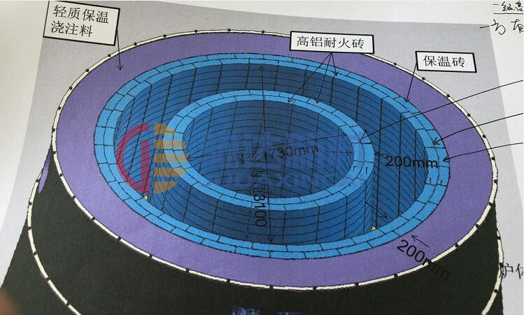 我公司是專業從事耐火材料的生產制造與窯爐的設計安裝工作,主要生產耐火磚有高鋁材質、粘土材質、剛玉材質、碳化硅材質和輕質隔熱耐火磚等耐火材料,近期我公司收到東莞雄冠環?萍加邢薰,發來的30t熱解爐使用耐火材料的分布圖并希望能夠得到我公司在材料與設計安裝上的支持,收到相關資料后我公司設計安裝部門進行了核對,并繪制相關使用的萬能弧耐火磚的設計砌筑方法。雄冠環保提供的熱解爐相關資料。