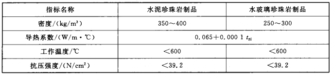 膨脹珍珠巖制品:常用水玻璃珍珠巖制品和水泥珍珠巖制品,制品應符合GB10303—1988《膨脹珍珠巖絕熱制品》標準,其性能如下表2