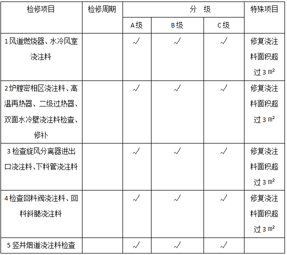 耐火耐磨保溫澆注料是循環流化床鍋爐應用較為廣泛的耐火材料之一,其主要被用于鍋爐環境較為惡劣、容易被損毀的風道燃燒器、爐膛密相區、旋風分離器、回料閥等部位。在進行爐襯檢修時,主要的項目如表1所示。